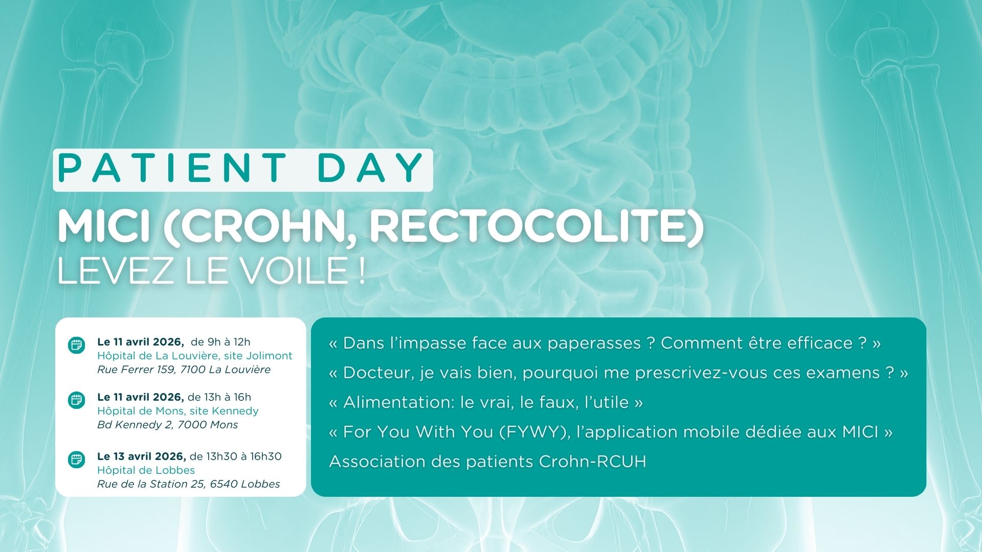Date : 13 avril 2026 horaire : 13h30-16h30 Gratuit Lieu : CHU Helora Lobbes (Rue de la Station 25, 6540 Lobbes) Inscriptions : https://www.helora.be/hopitaux/patient-day-mici-crohn-rectocolite-levez-le-voile-inscriptions?fbclid=IwY2xjawP37ENleHRuA2FlbQIxMABicmlkETFZQU9JczZvMWVFS1Y3dlRTc3J0YwZhcHBfaWQQMjIyMDM5MTc4ODIwMDg5MgABHsADlSrm3Ca87JBuPiRwWoqIj7pnnEDjVpNNz-MbtpZYi__Y4_W8_4EjBuzP_aem_DnTnoiOCi58bunU583nvnQ FB event : https://fb.me/e/3XZF6sjeC